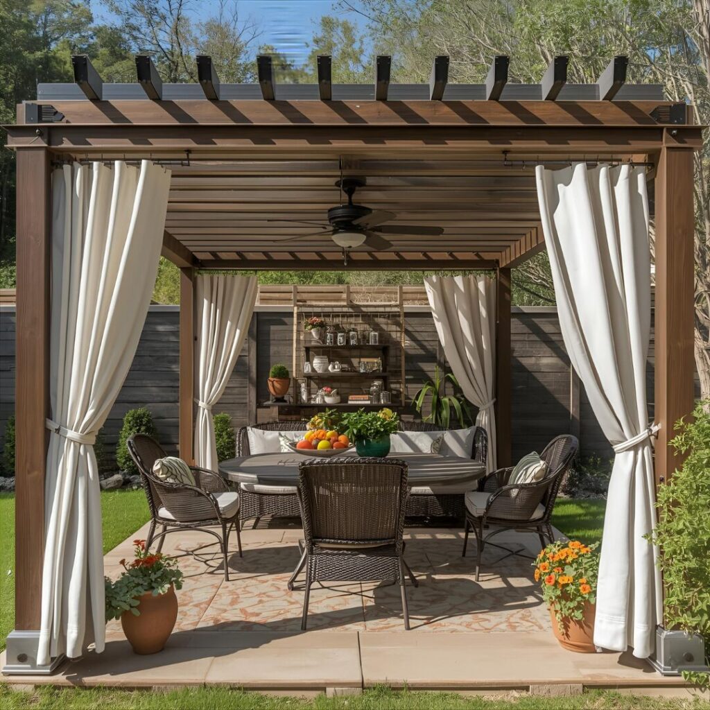 A pergola creates structure and shade, transforming your patio into a functional outdoor room. Add curtains for privacy or climbing plants for natural charm.