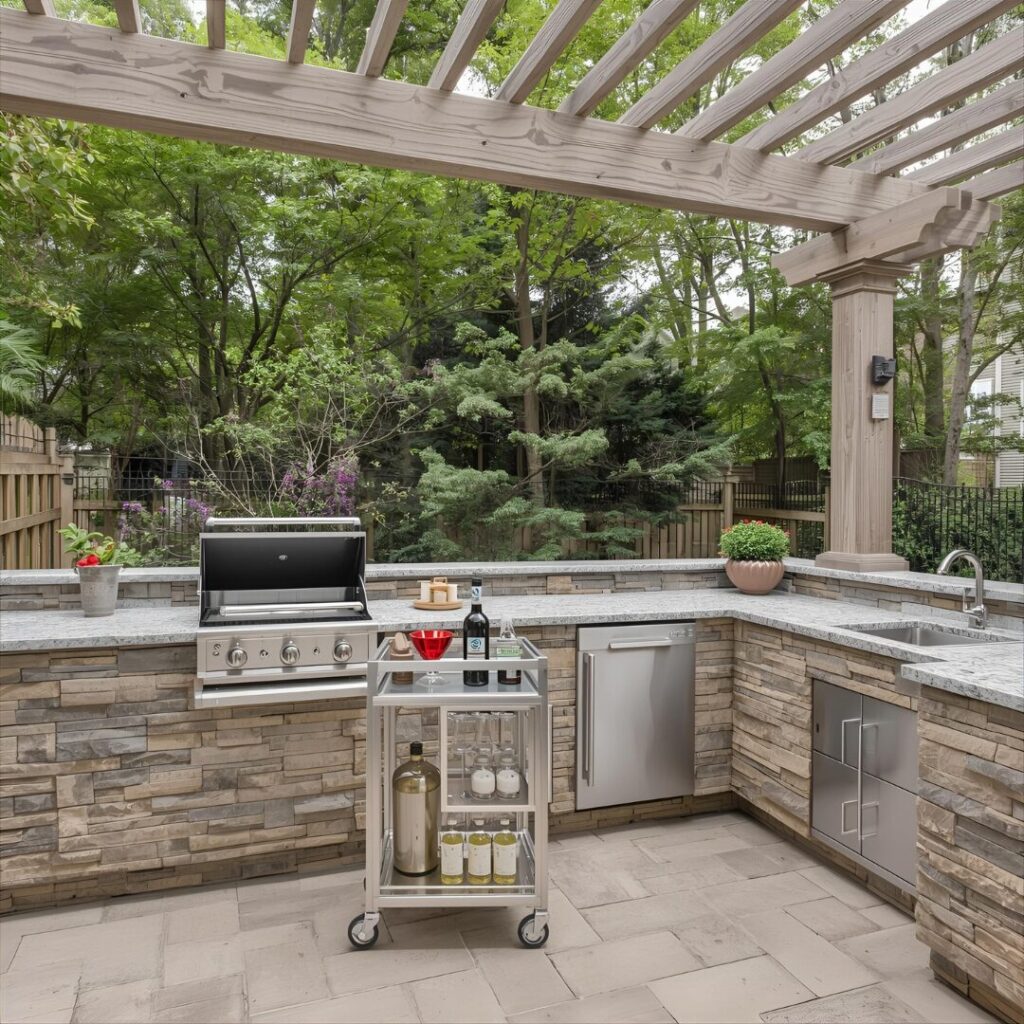 For those who love entertaining, an outdoor kitchen with a grill, prep space, and storage makes gatherings seamless. Even a small bar cart can elevate the experience.
