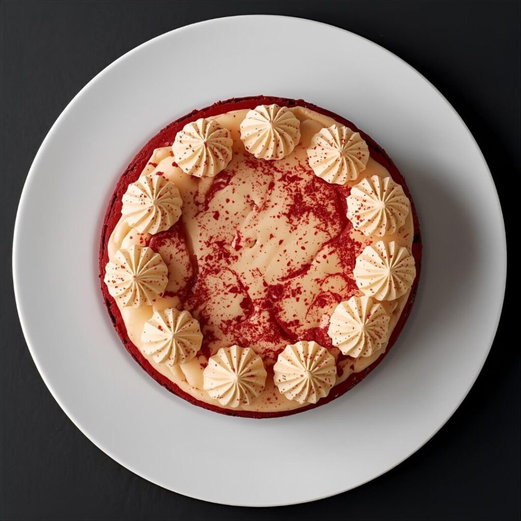 Trim the tops of your red velvet cakes if needed to level them. Place one layer on a serving plate and spread a thin layer of frosting to hold the cheesecake. Gently place the chilled cheesecake on top, then add the second layer of red velvet cake.
