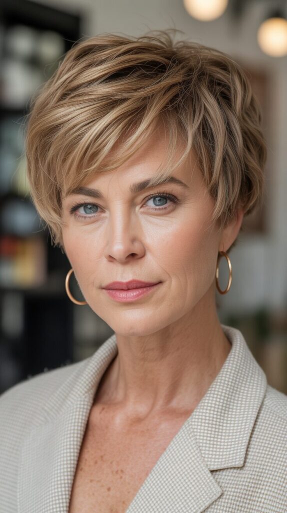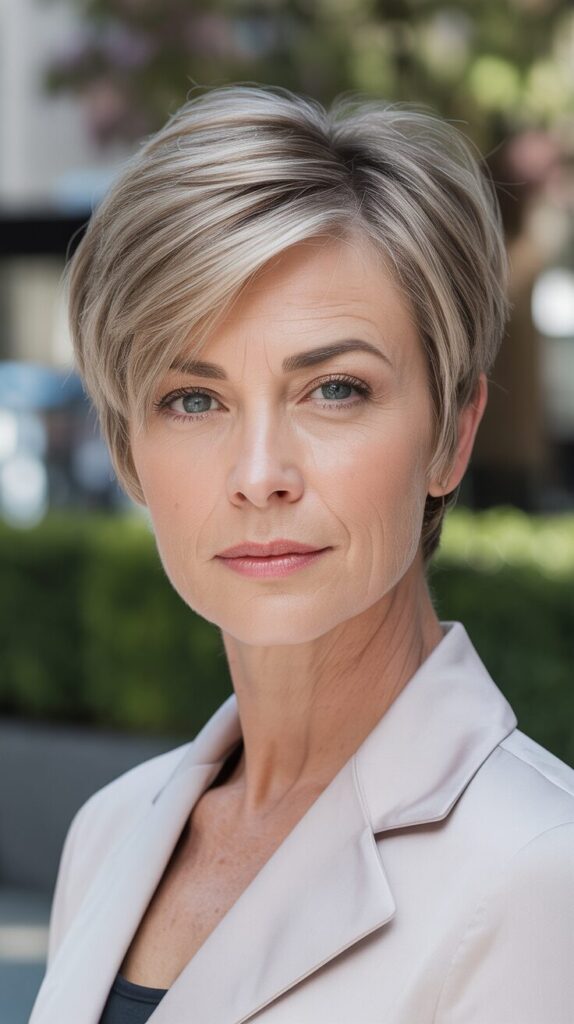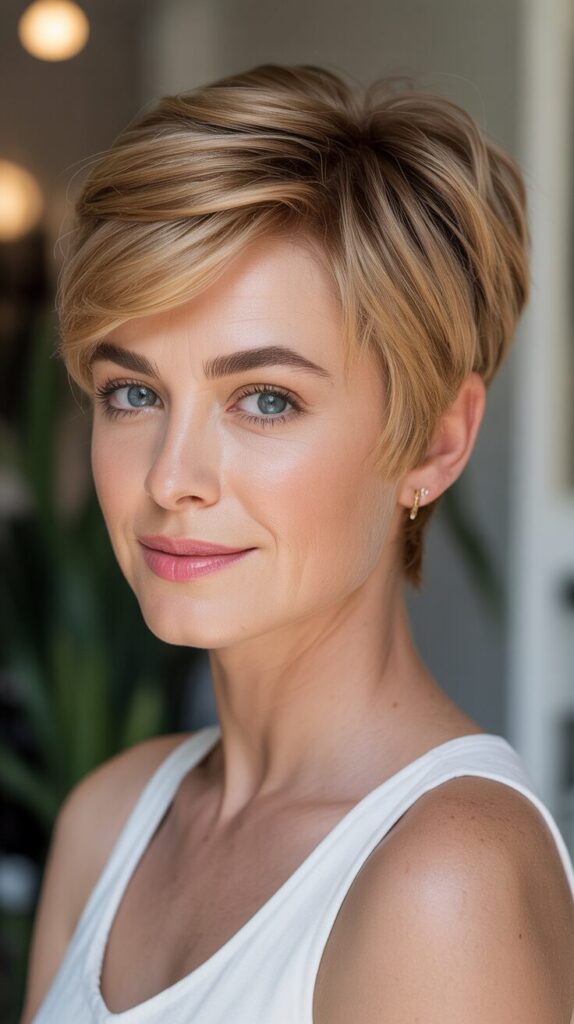 For a softer take on the pixie, ask for layers throughout with side-swept bangs that gracefully frame your face. The layers add volume and texture, while the side-swept bangs create a flattering, face-framing effect that’s more forgiving than full bangs. This style can be tailored to suit any face shape and works beautifully on women with fine to medium hair textures. It’s an elegant, feminine cut that’s both modern and timeless—perfect for professional settings or everyday wear.