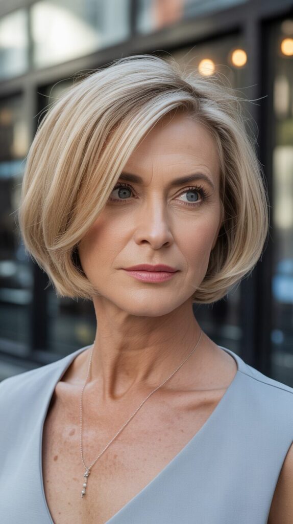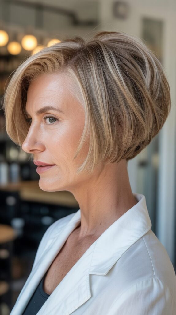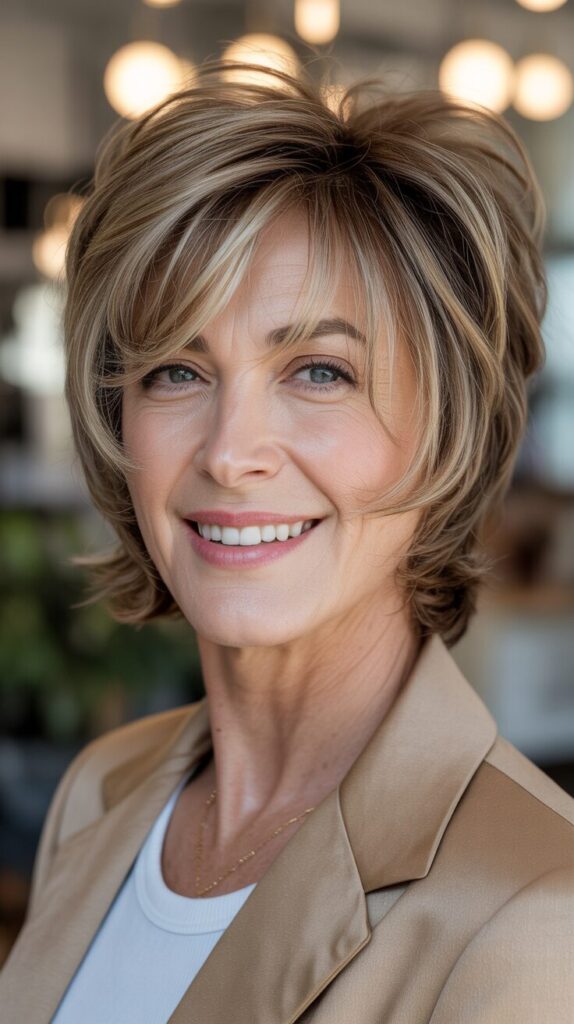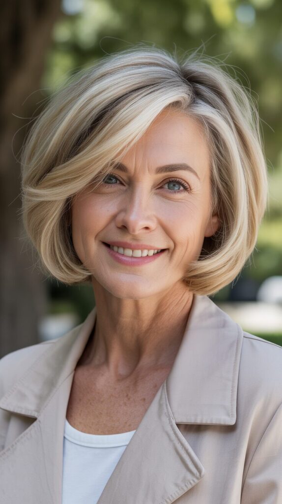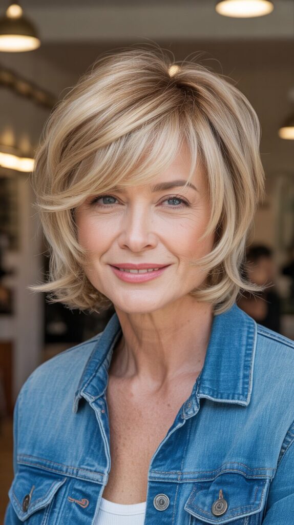 A soft layered bob that grazes the jawline is one of the most flattering cuts for women over 60. The layers remove weight while adding movement and bounce, preventing hair from looking flat or lifeless. This cut works with virtually any hair type and can be styled straight for a sleek look or with a slight wave for added softness. It frames the face beautifully, softening jawlines and bringing focus to your smile. It’s a timeless, sophisticated style that never goes out of fashion.