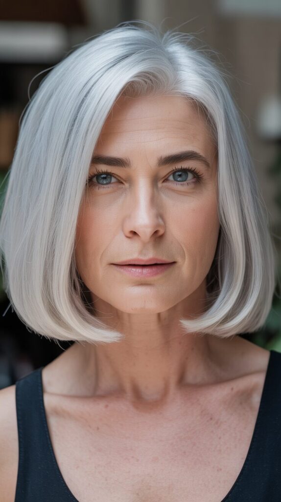 Showcase your beautiful silver hair with a blunt bob that emphasizes its shine and health. The straight, clean ends create a sharp, modern line that makes hair appear thicker and more lustrous. This cut can be worn at various lengths—from ear-length to chin-length—depending on your comfort level and face shape. The simplicity of the blunt cut allows your natural silver color to take center stage, creating a look that’s both powerful and polished. It’s a timeless style that always looks expensive.