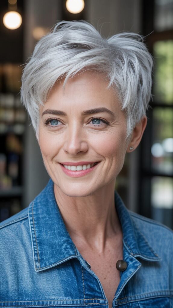 Celebrate your gorgeous natural silver or white hair with a pixie cut designed to showcase its beautiful color and texture. This cut typically features shorter sides with a longer, textured top that can be styled with a bit of product for piecey definition. The contrast between the shorter sides and longer top creates shape and dimension, making your silver hair look intentional and high-fashion rather than simply “gray.” It’s a low-maintenance style that makes a powerful style statement.