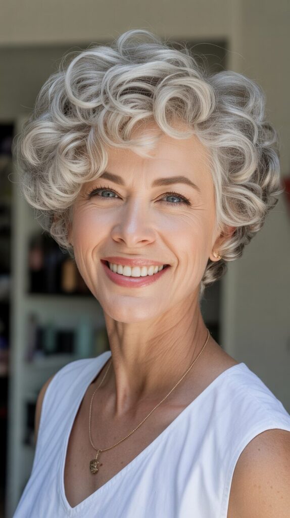 If you have natural curls or waves, a curly pixie can be absolutely stunning. This cut is tailored to work with your curl pattern, allowing your texture to create natural volume and shape. The stylist will cut your hair while dry to ensure each curl falls perfectly, resulting in a joyful, bouncy style that’s full of life. This cut highlights your facial features and showcases beautiful silver or white curls magnificently. It’s a wash-and-go style that requires minimal styling—just some curl-defining product and air drying.