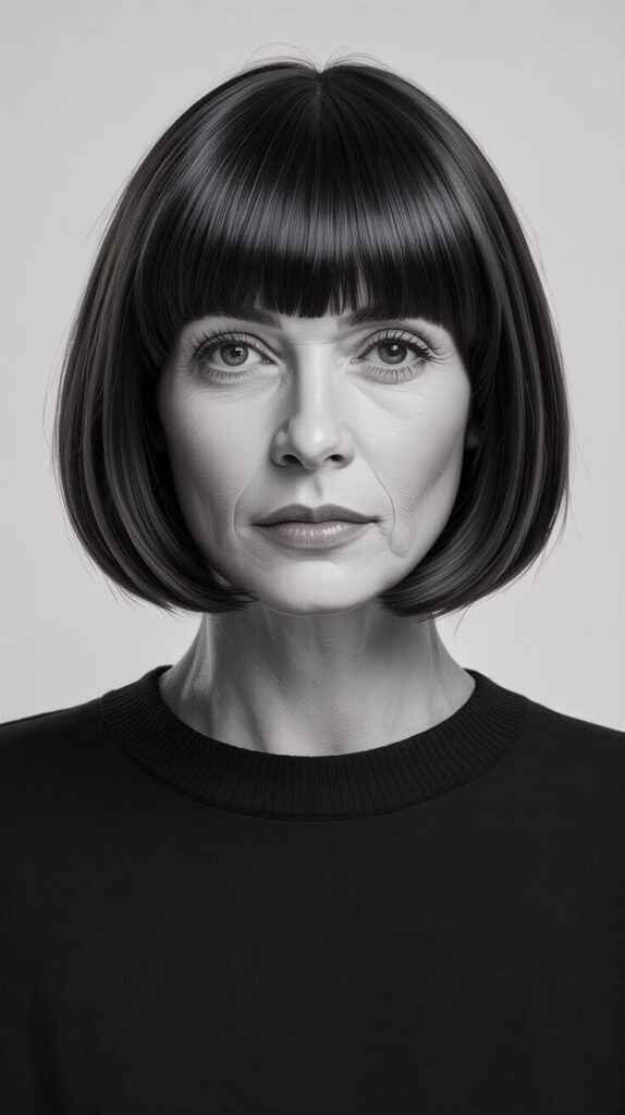 A blunt, one-length bob that ends at the chin or just above, combined with full, straight-across bangs, creates a chic, artistic look that’s incredibly age-defying. The strong, clean lines of this cut create structure and make hair appear thicker and healthier. The bangs draw attention to your eyes, while the chin-length bob can help soften a longer face or balance a stronger jawline. This bold, graphic style works particularly well with straight hair and makes a powerful impact.