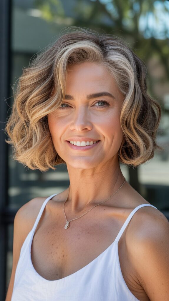 A wavy bob that sits just above the shoulders with strategic face-framing layers is endlessly flattering and youthful. The waves add softness and movement, while the face-framing layers highlight your cheekbones and eyes. This cut works with natural waves or can be easily created with a curling iron or sea salt spray. It’s a versatile, romantic style that can be dressed up or down and works beautifully for both casual and formal occasions. The length is perfect for those not ready for a super-short cut.