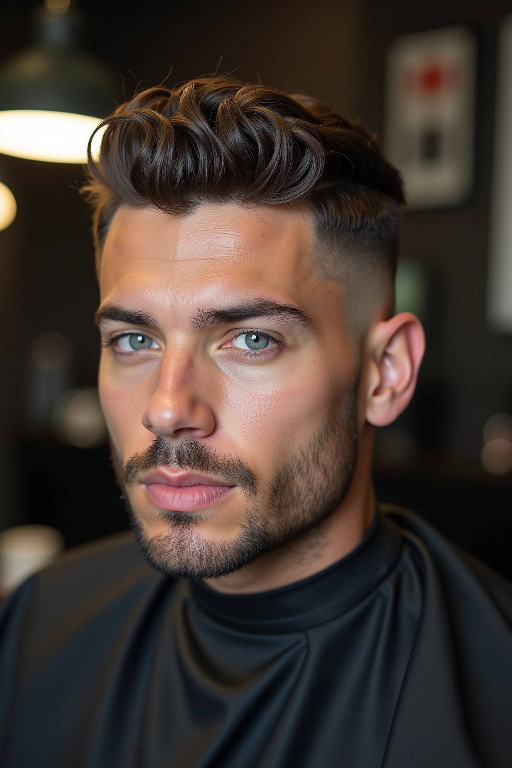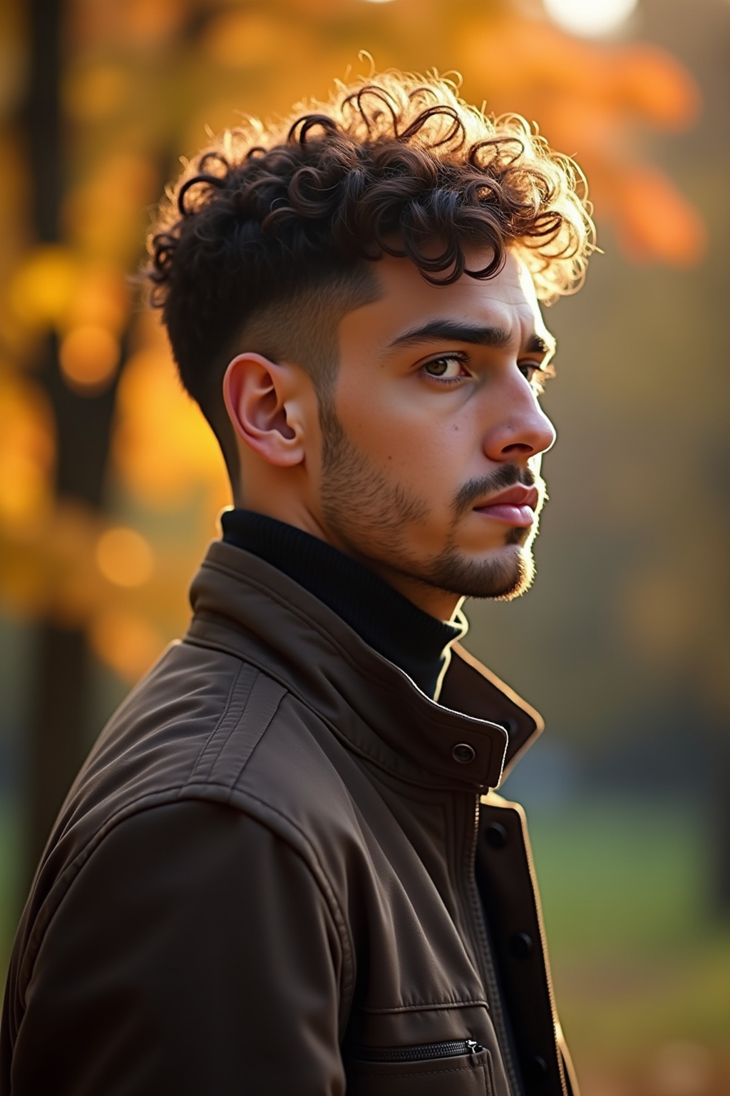 Der Taper Fade mit Locken ist besonders vorteilhaft für ovale und herzförmige Gesichter, da die Volumen-Verteilung diese natürlich ausbalancierten Gesichtsformen optimal ergänzt. Bei eckigen Gesichtern sorgt der weiche Übergang des Taper-Schnitts für eine angenehme Milderung kantiger Kieferlinien, während die Lockenpracht oben für Ausgewogenheit sorgt. Runde Gesichter profitieren von einem höheren Volumen am Oberkopf, das das Gesicht optisch streckt. Längliche Gesichter hingegen sollten mehr Fülle an den Seiten behalten, um die Proportionen auszugleichen. Ein Mid-Fade eignet sich für die meisten Gesichtsformen, während ein High-Fade bei markanten Wangenknochen besonders vorteilhaft wirkt. Der graduelle Übergang der Haarstruktur schafft bei nahezu jeder Kopfform eine harmonische Silhouette.