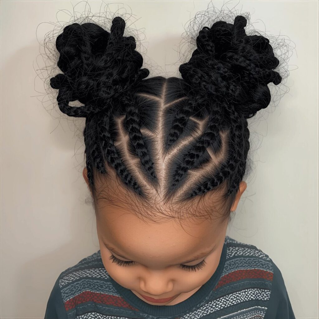 Zigzag cornrow braids bring creativity and fun to your toddlerโs hairstyle. The unique parting pattern stands out, giving the braids a stylish twist. Itโs a protective hairstyle that lasts for days, keeping your childโs hair healthy and easy to manage. Parents love it for its durability and eye-catching design.