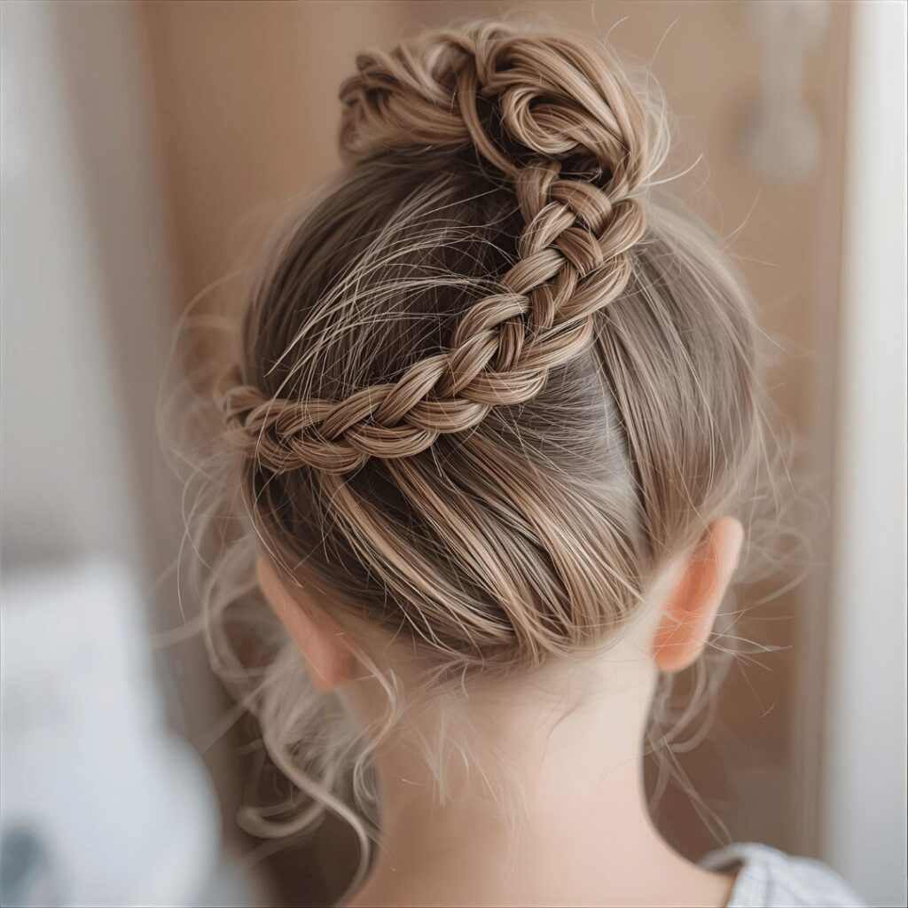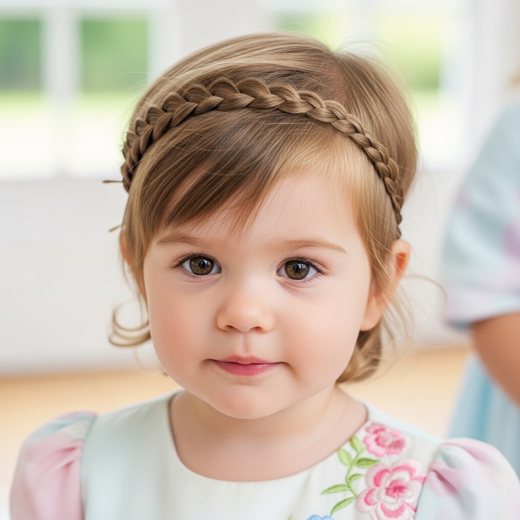 A braided headband gives a sweet, innocent look while keeping hair off the face. Take a small front section, braid it, and pin it across the forehead like a headband. Itโs a great way to style your toddlerโs hair without using actual accessories. This look pairs perfectly with dresses and special events.