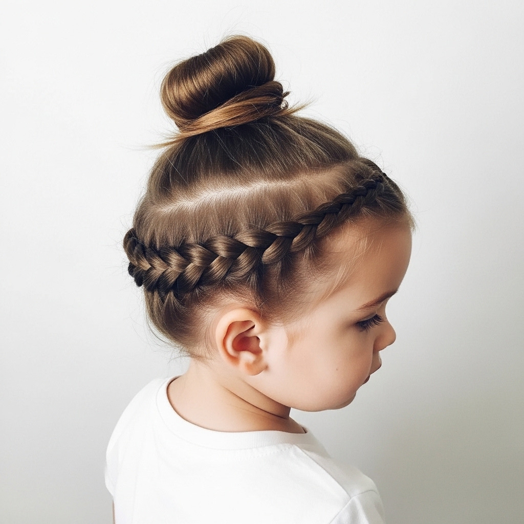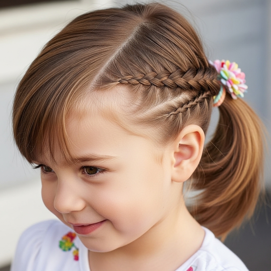 The side braided ponytail adds a modern and stylish flair to toddler hair. Simply create a side part, braid one section along the hairline, and gather all hair into a ponytail. Itโs quick to make and looks effortlessly cute. This look works best on medium to long hair and pairs nicely with fun hair accessories.