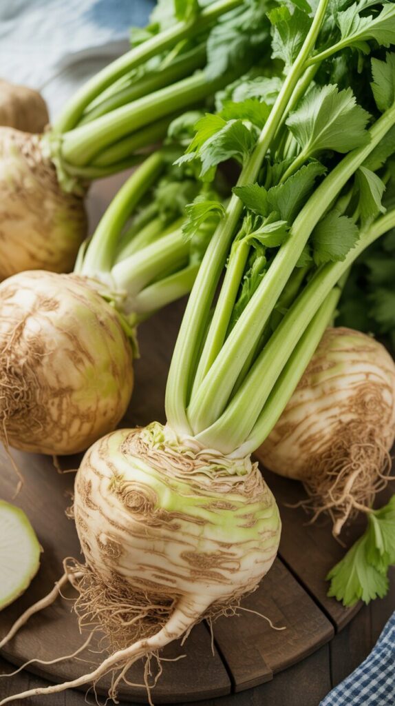 Celeriac is a root vegetable with a mild celery flavor, great for mashes, soups, and roasted dishes. Its knobby appearance may seem intimidating, but its flavor is rewarding.