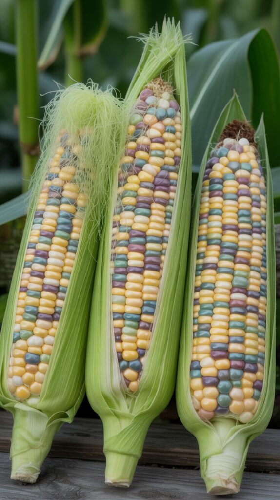 This heirloom corn variety is famous for its rainbow-colored kernels, making it a stunning ornamental and edible crop. It’s used for popcorn and flour rather than sweet corn.
