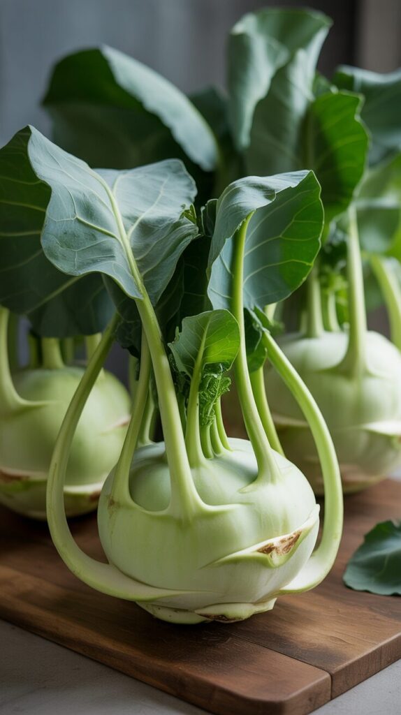 Kohlrabi is a bulb-shaped vegetable with a crisp, apple-like texture and a mild cabbage flavor. It’s versatile, eaten raw with dips, shredded in slaws, or roasted.