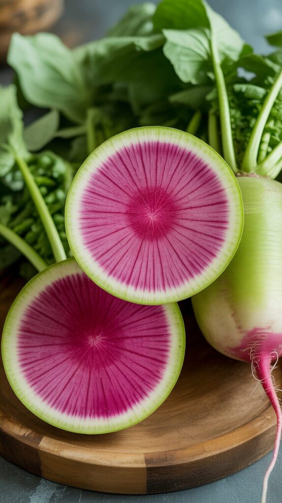 With a green exterior and a bright pink interior, watermelon radish is a showstopper. It has a crisp texture and a mildly peppery taste.