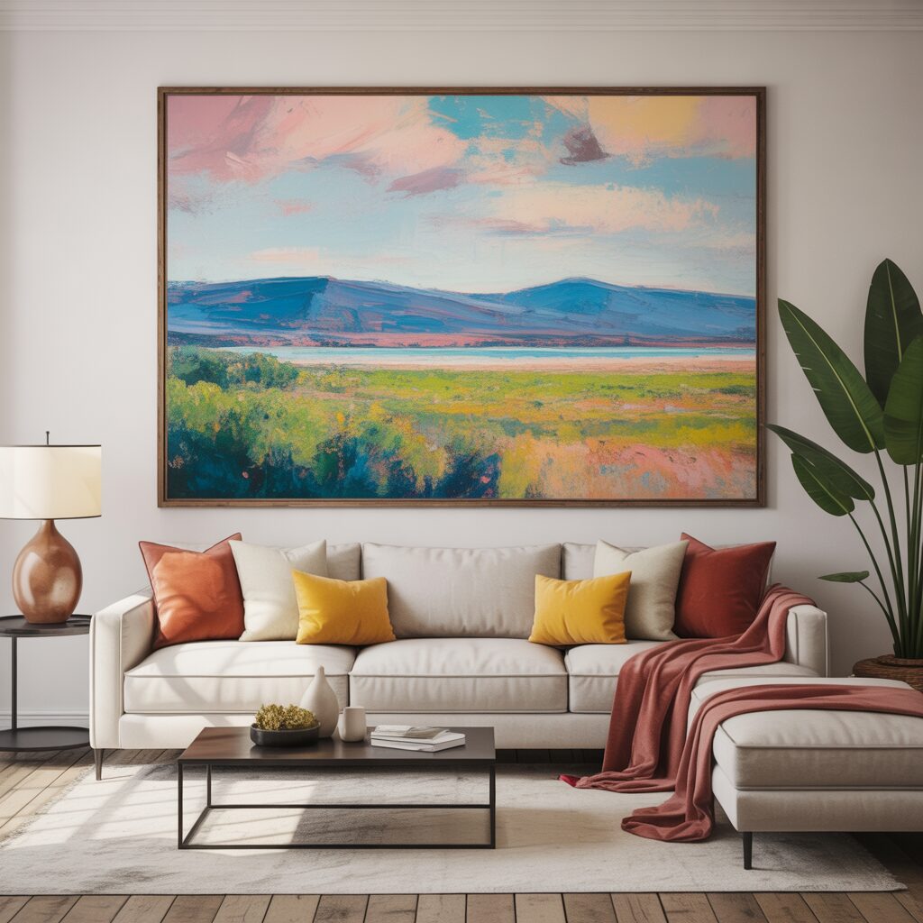 A single oversized art piece creates a bold focal point above the sofa. It adds drama while keeping the design simple and cohesive. Abstracts, landscapes, or portraits all work depending on your style. One large artwork keeps the wall uncluttered yet striking.