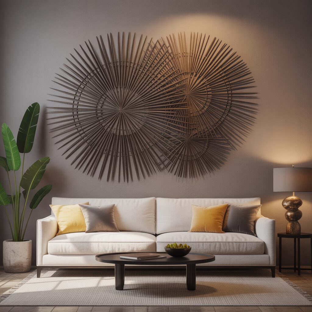 Sculptural decor, such as metal designs or wood carvings, adds dimension to the wall. Unlike flat artwork, 3D pieces create shadow and texture. They’re perfect for making a bold statement above the sofa. This type of art makes the space truly unique.