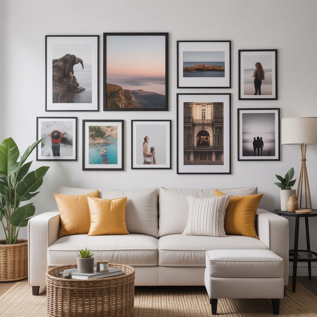 A gallery wall brings personality with multiple framed prints or photos. Mixing sizes and frames adds dimension and visual interest. This idea works well for displaying family photos, travel memories, or art collections. It turns the space into a storytelling feature.
