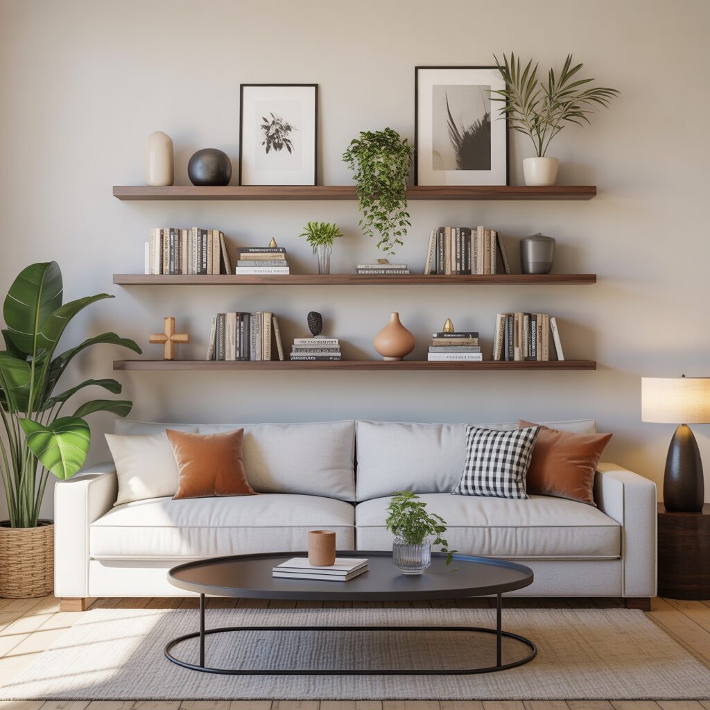 Floating shelves offer both function and style above the sofa. You can display books, vases, small plants, and art pieces. The layered look feels dynamic and versatile. Shelves also allow you to refresh decor seasonally.