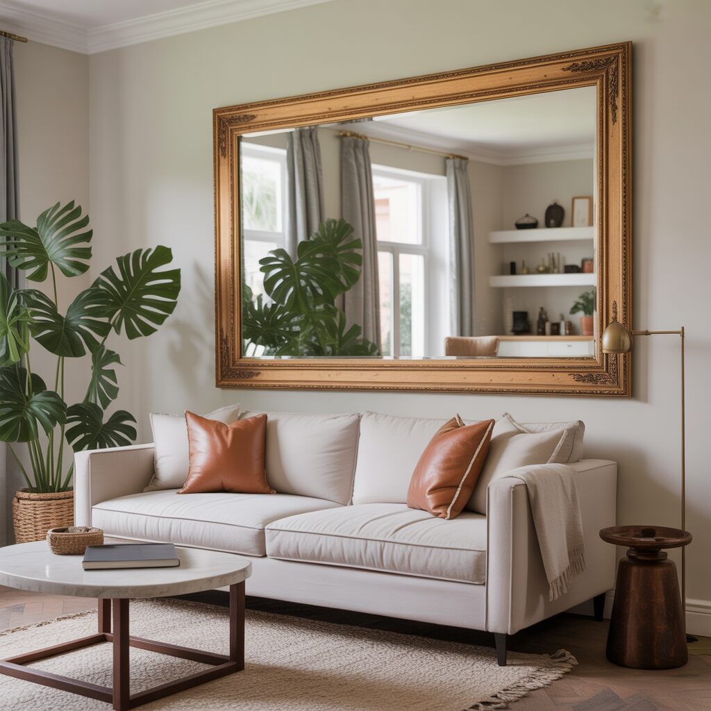 An oversized mirror above the sofa reflects light and makes the room feel larger. Framed mirrors add character, while frameless designs keep it modern. This idea works especially well in smaller living rooms. It’s both decorative and practical.