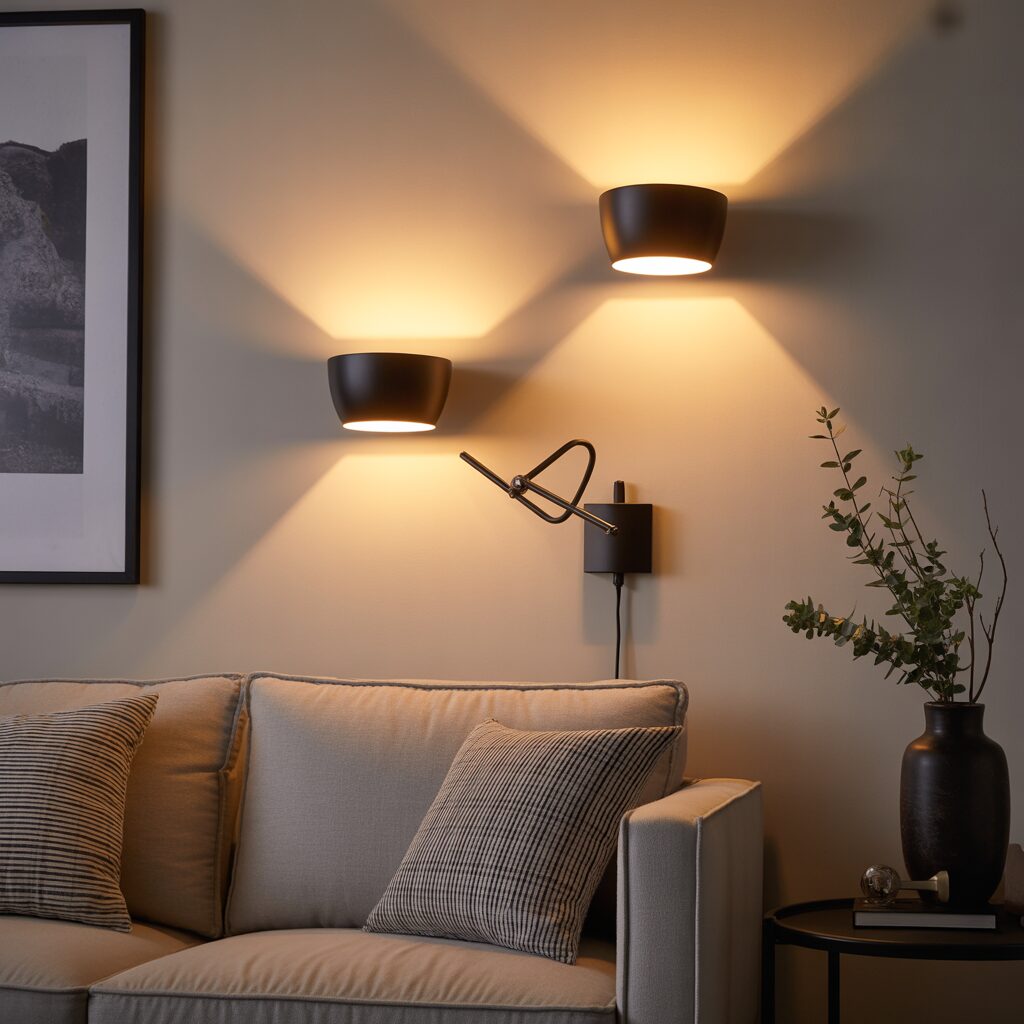 Sconces or swing-arm lamps add light and style above the sofa. They provide ambiance and make the space more functional for reading. Decorative lighting doubles as wall art with its sculptural quality. It adds depth to the overall design.