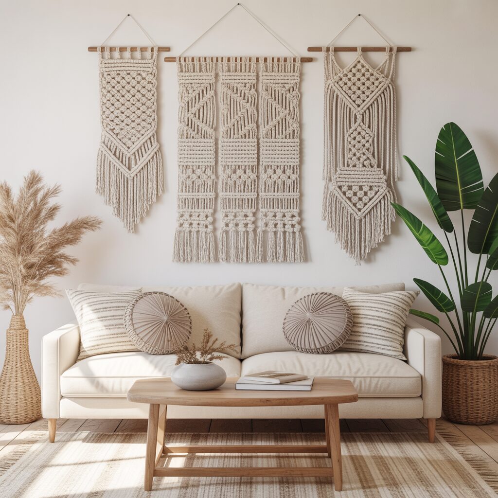 Macrame, woven textiles, or fabric panels bring warmth and texture to the wall. These pieces soften the hard lines of furniture and add a cozy vibe. They’re perfect for bohemian or eclectic living rooms. Textured decor also creates visual balance.