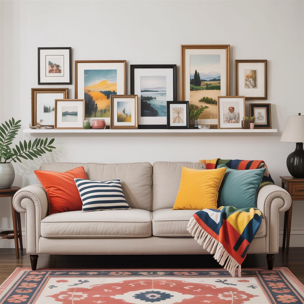 Leaning and layering multiple frames on a narrow shelf above the sofa creates depth. This casual look feels artistic and easy to change over time. It works for both modern and traditional interiors. The layered effect adds personality and charm.