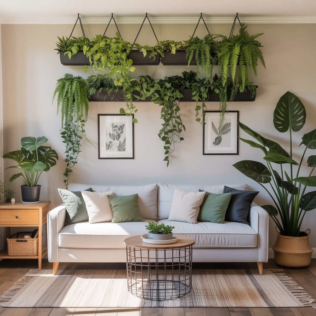 Hanging planters, vertical gardens, or mounted plant shelves bring life above the sofa. Greenery adds freshness and softens the room’s atmosphere. Plants also complement a wide variety of design styles. This idea connects the indoors with nature beautifully.