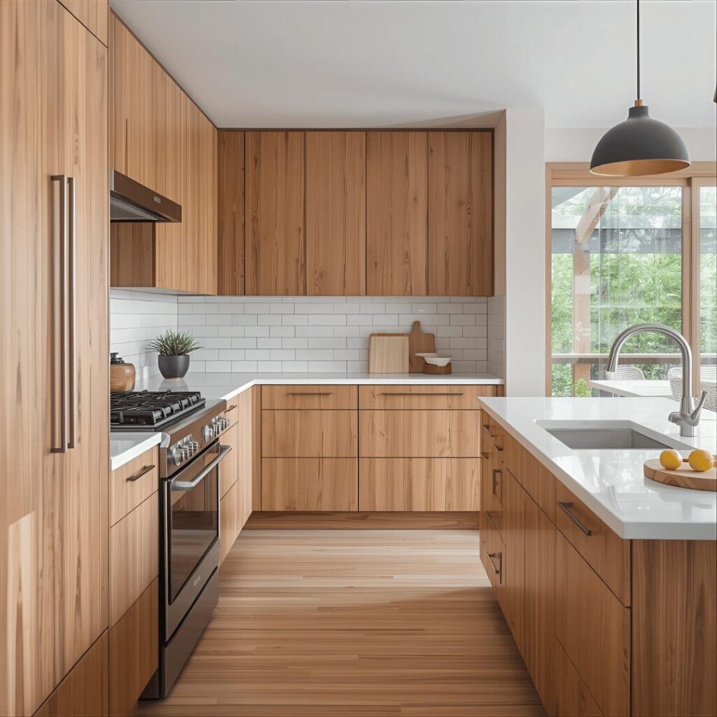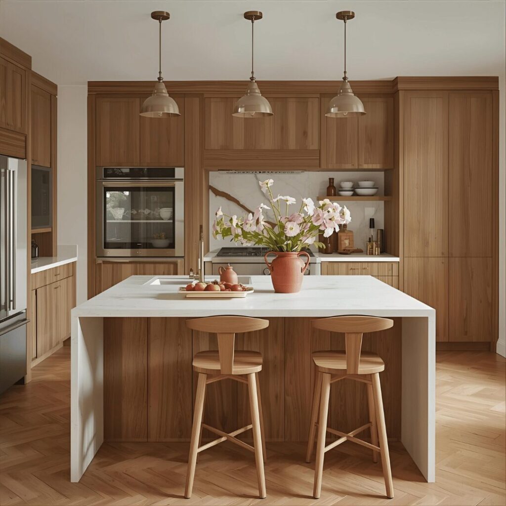 Natural wood tone cabinets celebrate the inherent beauty of wood grain and warm honey, oak, or walnut tones that create richly inviting kitchens filled with organic character. This approach moves away from painted cabinetry entirely, instead showcasing wood’s natural variations, knots, and grain patterns that make each kitchen unique and full of personality. Light to medium wood tones like white oak, maple, or light walnut create warmth without darkness, reflecting light beautifully while adding substantial texture and visual interest. Natural wood cabinets work wonderfully in modern organic kitchens, Scandinavian designs, Japanese-inspired spaces, or contemporary settings where natural materials are celebrated rather than hidden. The key to keeping wood-tone kitchens feeling current rather than dated is selecting clean, simple cabinet door styles without ornate detailing, and balancing the wood with lighter elements like white countertops, subway tiles, or light-colored walls. Perfect for homeowners who love natural materials, those wanting a kitchen with soul and character that improves with age, or anyone drawn to biophilic design that connects indoor spaces to nature through organic materials and earthy tones.