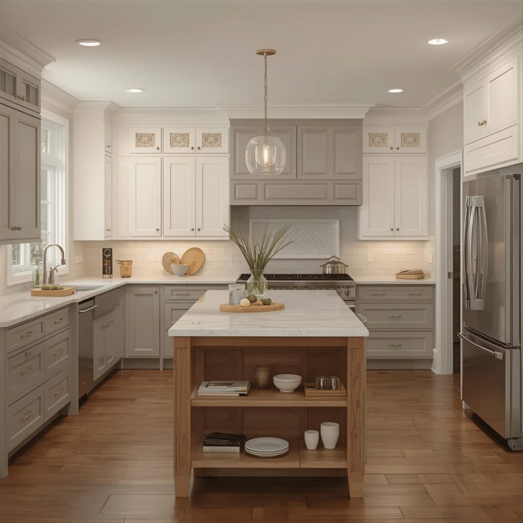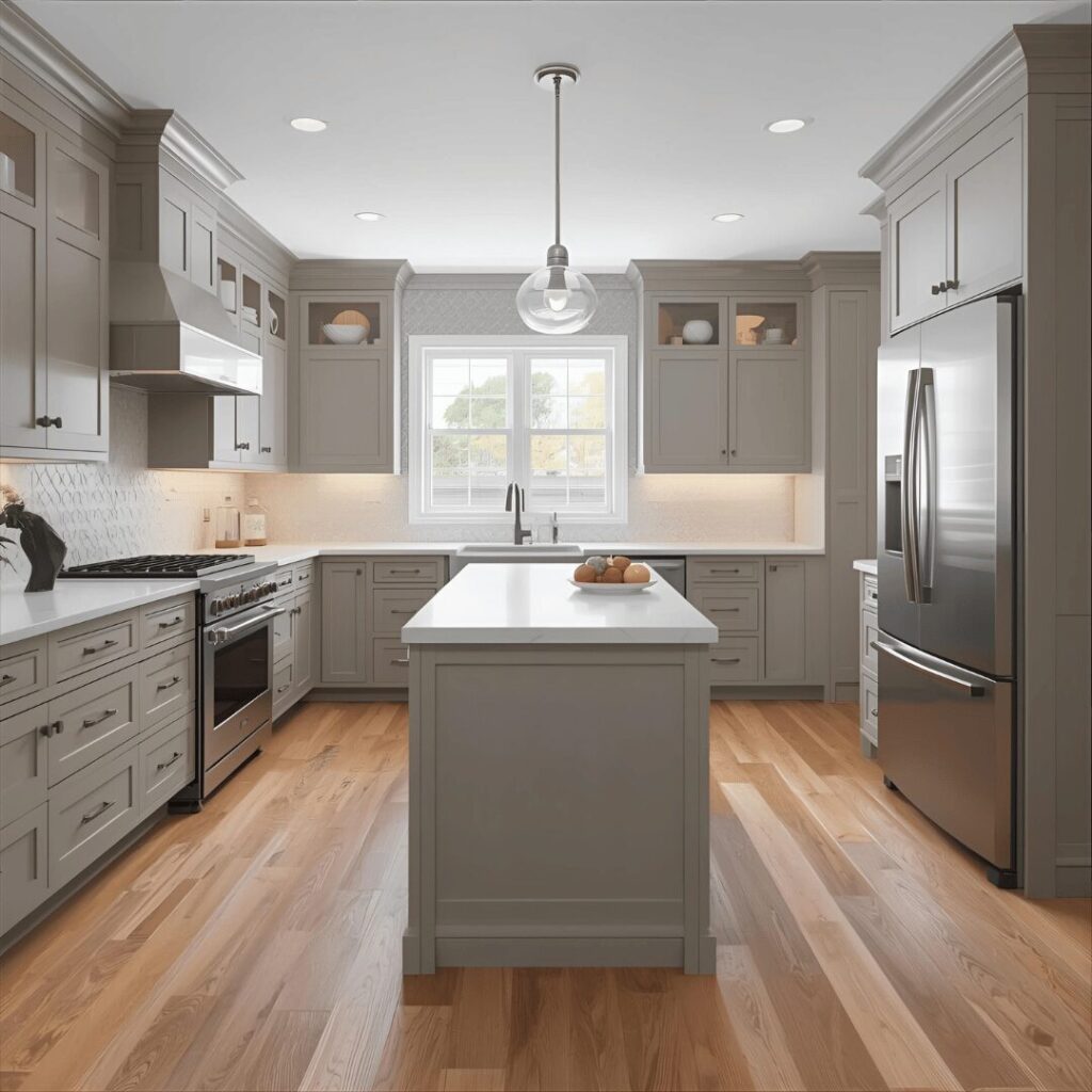 Warm grey with wood floors creates a balanced, contemporary kitchen that pairs modern cabinet colors with the timeless warmth and organic beauty of natural wood flooring. This popular combination uses warm grey cabinetsโ€”grey with beige or taupe undertones rather than cool blue-greyโ€”paired with honey, oak, or walnut wood floors that introduce warmth and prevent the space from feeling cold. The wood flooring grounds the kitchen literally and figuratively, providing a warm foundation that balances the cooler-leaning cabinet color while adding natural texture and character. This pairing works beautifully because warm grey serves as a sophisticated, modern neutral that doesn’t compete with wood’s natural beauty, allowing both elements to shine without visual conflict. The combination feels current yet timeless, modern yet warm, sophisticated yet approachableโ€”hitting the sweet spot that makes kitchens feel simultaneously on-trend and enduringly beautiful. Perfect for homeowners wanting contemporary style without coldness, those with existing hardwood floors they want to complement rather than replace, or anyone seeking a sophisticated color combination that bridges traditional wood elements with modern grey tones, this pairing creates kitchens that feel polished, welcoming, and beautifully balanced between old and new.