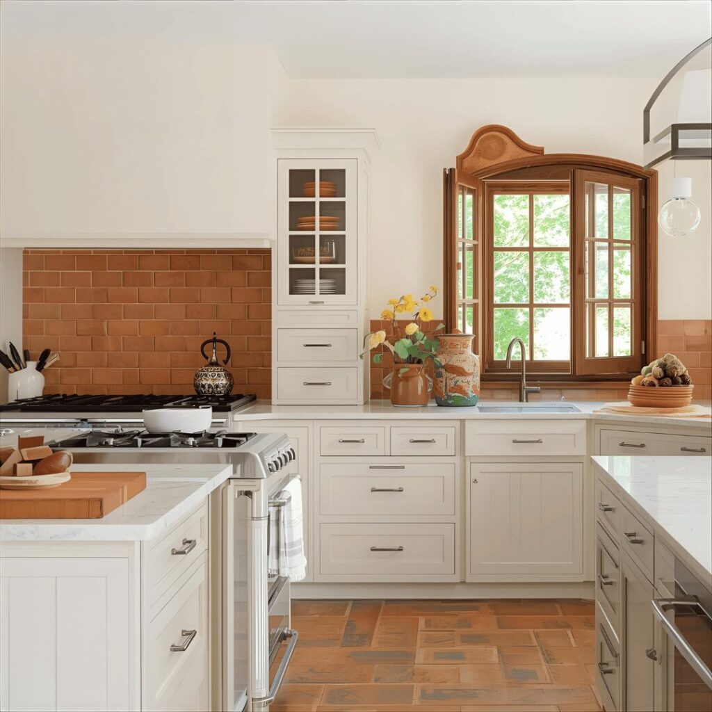 Earthy terracotta accents introduce warm, sun-baked clay tones into neutral kitchens through tiles, pottery, accessories, or small painted elements that add Mediterranean warmth. This trend-forward approach uses a neutral base of cream, beige, or warm white, then layers in terracotta through a backsplash, decorative tiles, displayed pottery, pendant light shades, or even a painted accent wall. The rich, earthy orange-brown tones of terracotta bring instant warmth and organic character, creating a connection to Mediterranean, Spanish, or Southwestern design traditions. Terracotta’s natural, handmade quality introduces artisanal charm and prevents neutral kitchens from feeling too perfect or sterile, adding a lived-in, collected-over-time aesthetic. The warm clay tones complement virtually all neutral bases while adding a pop of earthy color that feels grounded rather than trendy or artificial. Ideal for homeowners drawn to Mediterranean or Spanish-inspired design, those wanting to add warmth and personality to neutral kitchens without bold, saturated colors, or anyone seeking organic, natural materials that connect indoor spaces to earth and nature, terracotta accents create kitchens that feel warm, welcoming, and filled with character.