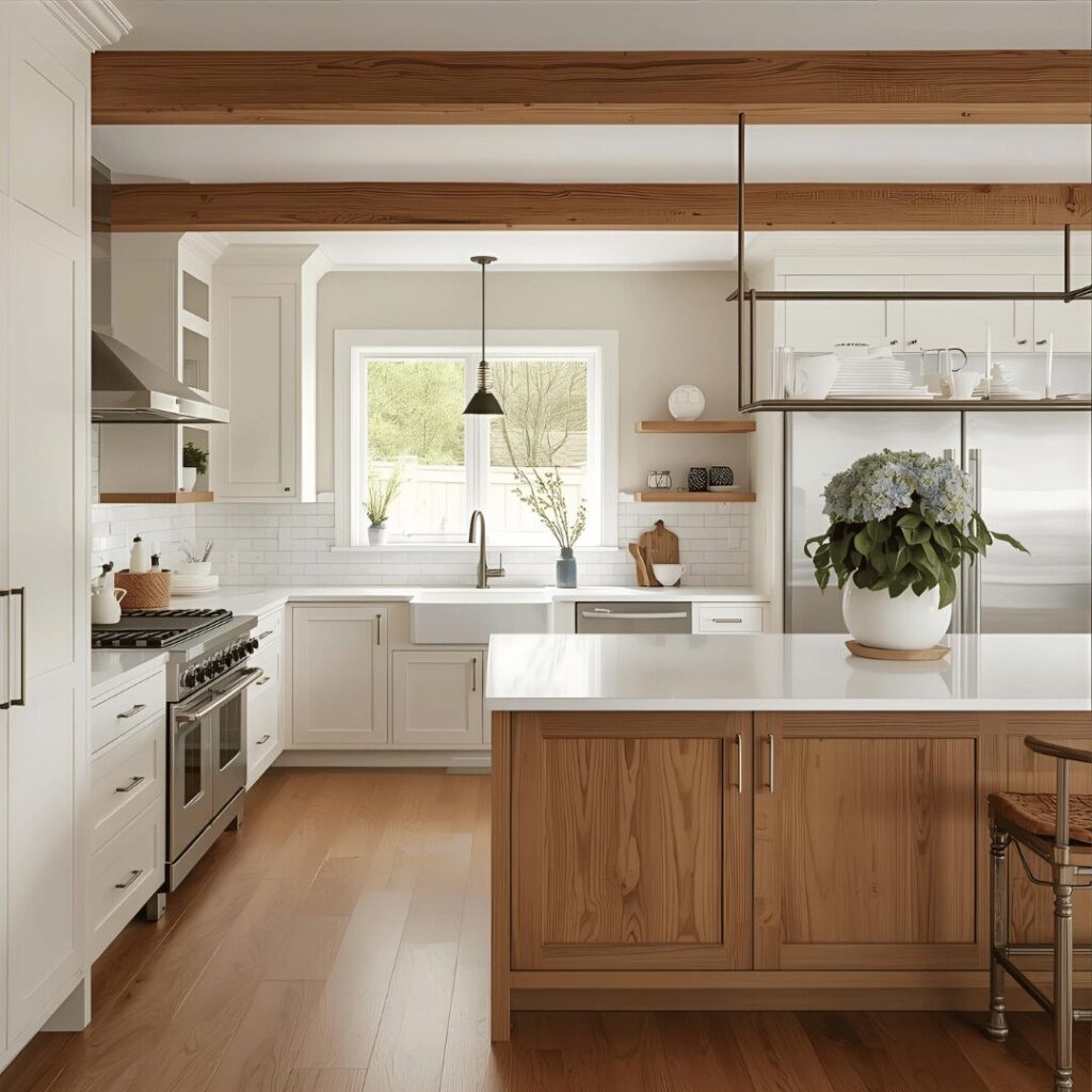 Creamy white cabinets with natural wood accents create a soft, inviting kitchen that balances light cabinetry with the warmth and texture of wood elements throughout the space. This popular combination uses off-white or cream-colored cabinets with subtle warm undertones rather than stark bright white, paired with natural wood on floating shelves, island countertops, ceiling beams, or open shelving. The cream base keeps the kitchen feeling bright and spacious while the wood accents introduce organic warmth, natural texture, and visual interest that prevents the space from feeling too clinical or cold. This pairing works beautifully because the warm undertones in cream cabinets harmonize perfectly with wood tones, creating a cohesive color story that feels intentional and sophisticated. The combination is incredibly versatile, working equally well in modern farmhouse kitchens, Scandinavian-inspired spaces, transitional designs, or coastal cottages depending on the wood species and hardware choices you select. Perfect for homeowners wanting a bright kitchen that still feels warm and welcoming, those who appreciate natural materials and organic textures, or anyone seeking a timeless combination that will remain beautiful through changing design trends.