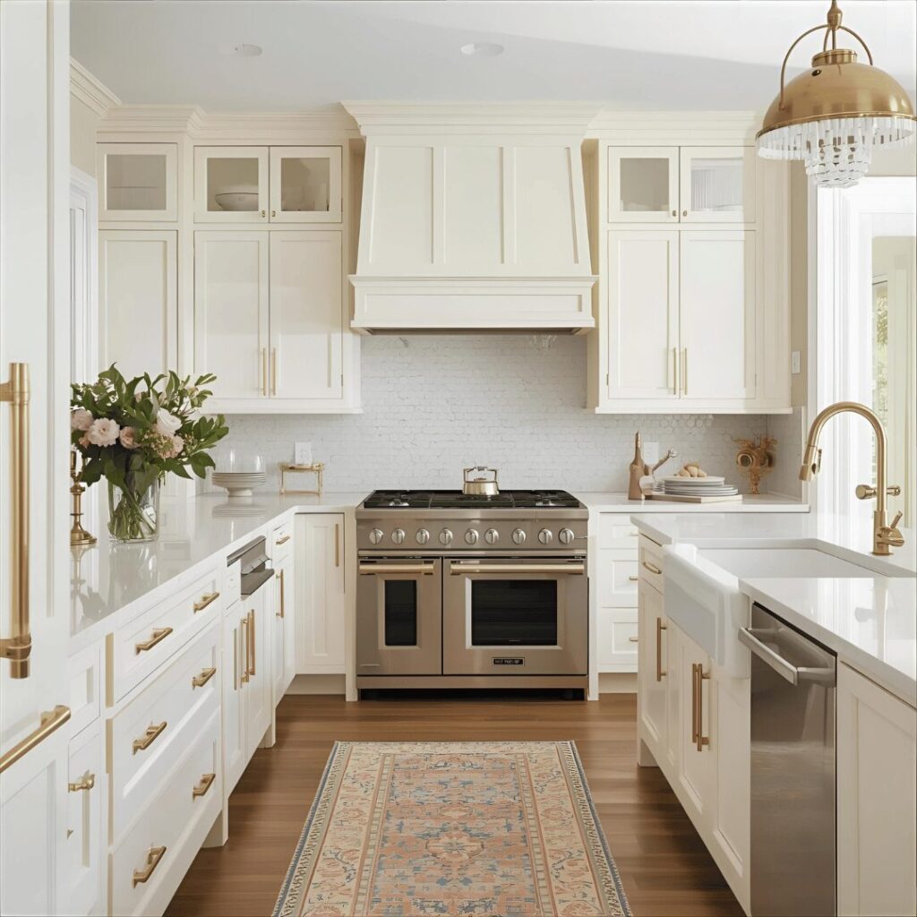 Warm white with brass and gold fixtures elevates simple neutral kitchens into luxurious, sophisticated spaces through the addition of warm metallic accents that catch light beautifully. This glamorous approach uses soft white or cream as the primary cabinet and wall color, then layers in brass, aged brass, brushed gold, or champagne-toned hardware, faucets, light fixtures, and accessories. The warm metallic tones complement warm white perfectly, creating a cohesive color story that feels rich, intentional, and decidedly upscale without being ostentatious. Brass and gold add a touch of jewelry-like sparkle that elevates everyday spaces into special environments, making you feel pampered even during routine cooking tasks. This combination works beautifully in various styles from modern glam to vintage-inspired to transitional elegance, proving that metallics are incredibly versatile when selected in warm tones. Perfect for homeowners wanting to add luxury without major renovation costs (changing hardware and fixtures is relatively affordable), those drawn to the warm metals trend that’s replaced cooler stainless and chrome, or anyone wanting their kitchen to feel special and elevated while maintaining neutral, timeless base colors that won’t look dated as trends evolve.