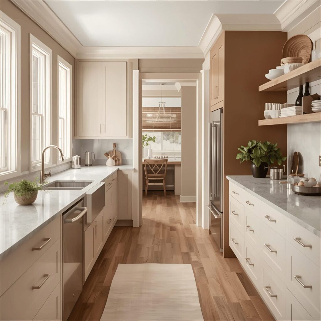 Beige and tan color palettes create monochromatic, layered kitchens that feel sophisticated, calming, and cohesive through the use of various shades within the same warm neutral family. This tonal approach might include light beige cabinets, slightly darker tan walls, medium-toned wood floors, cream countertops, and warm bronze hardware, creating depth through subtle variations rather than high contrast. The beauty of monochromatic neutral kitchens lies in their serene, uncluttered appearanceโ€”without bold colors competing for attention, the eye moves smoothly throughout the space, creating a sense of calm and order. This palette works wonderfully as a backdrop for natural materials like wood, stone, and linen that introduce texture without disrupting the cohesive color story. The various beige and tan tones create dimension and prevent the space from feeling flat despite the limited color range, proving that neutral doesn’t have to mean boring. Ideal for homeowners wanting serene, spa-like kitchens, those who prefer subtle sophistication over bold statements, anyone seeking a versatile neutral backdrop that coordinates effortlessly with any accent color or decorative style, or those drawn to the current trend toward tonal, monochromatic interior design that emphasizes texture and material over color contrast.
