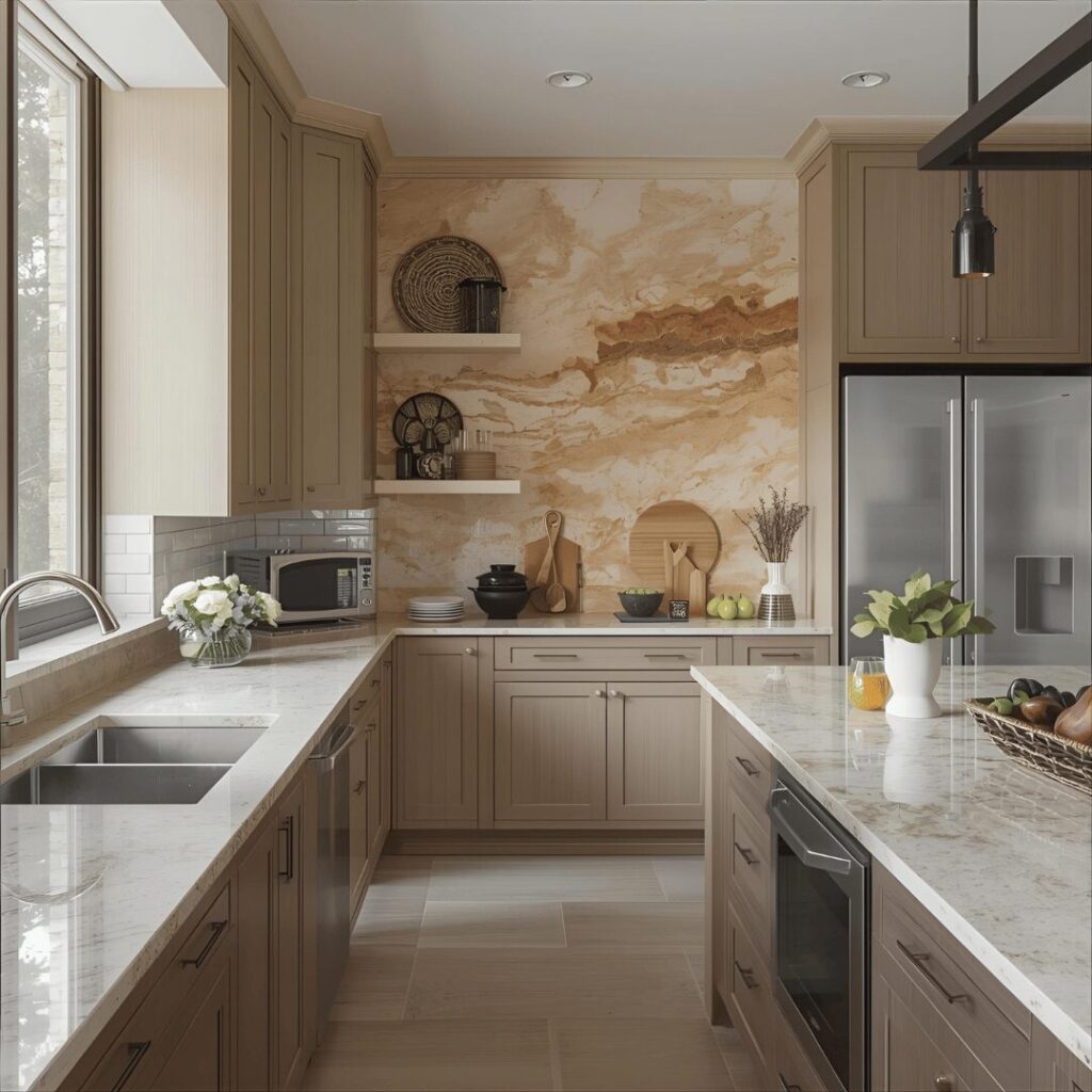 Natural stone and warm countertops anchor neutral kitchens through the introduction of organic materials with inherent warmth, veining, and character that create visual interest. This approach might feature warm-toned quartzite, beige travertine, cream marble with gold veining, or engineered quartz in warm neutral shades that complement cabinetry while adding natural beauty. Stone countertops introduce organic patterns and variations that prevent neutral kitchens from feeling too uniform or manufactured, adding an element of nature’s artistry to functional surfaces. Warm-toned stones pair beautifully with both painted and wood-tone cabinets, serving as a unifying element that ties together different materials and finishes throughout the space. The natural veining and color variations in stone provide built-in decoration, eliminating the need for busy backsplashes or excessive accessories while maintaining visual interest. Perfect for homeowners who appreciate natural materials and organic beauty, those wanting low-maintenance surfaces that age gracefully, or anyone seeking to invest in quality materials that add lasting value and timeless beauty to their kitchen, warm stone countertops create a sophisticated foundation that elevates the entire space while maintaining the warm neutral aesthetic.