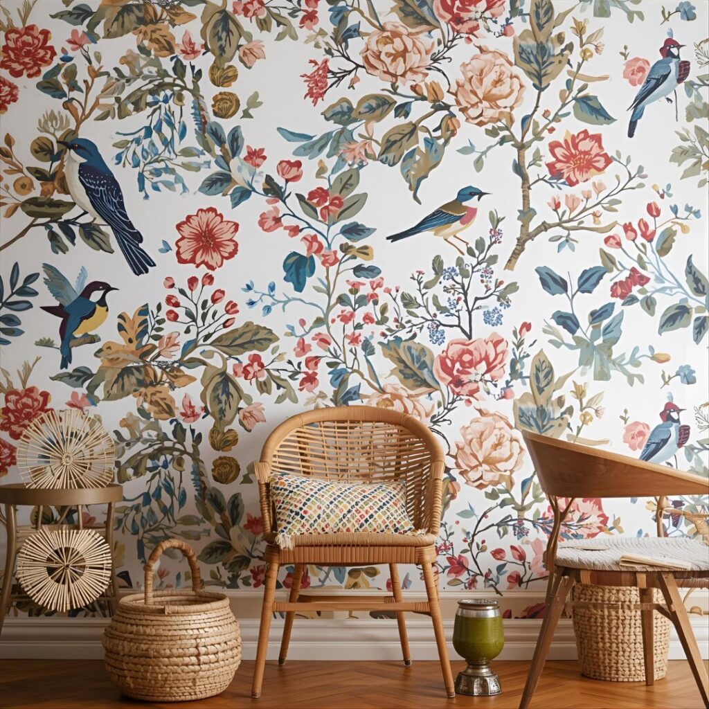 Transform a plain wall into a whimsical focal point with hand-painted murals or bold wallpapers. Patterns like florals, birds, or abstract designs create instant personality. A feature wall becomes a conversation piece that uplifts the entire room.