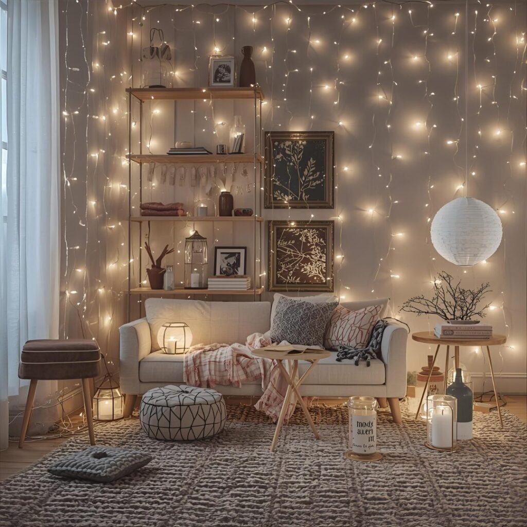 Soft, glowing lights create a magical and inviting atmosphere. Fairy lights draped across shelves, mirrors, or ceilings add subtle whimsy. Paper lanterns or globe string lights can also enhance patios and bedrooms for a dreamlike touch.
