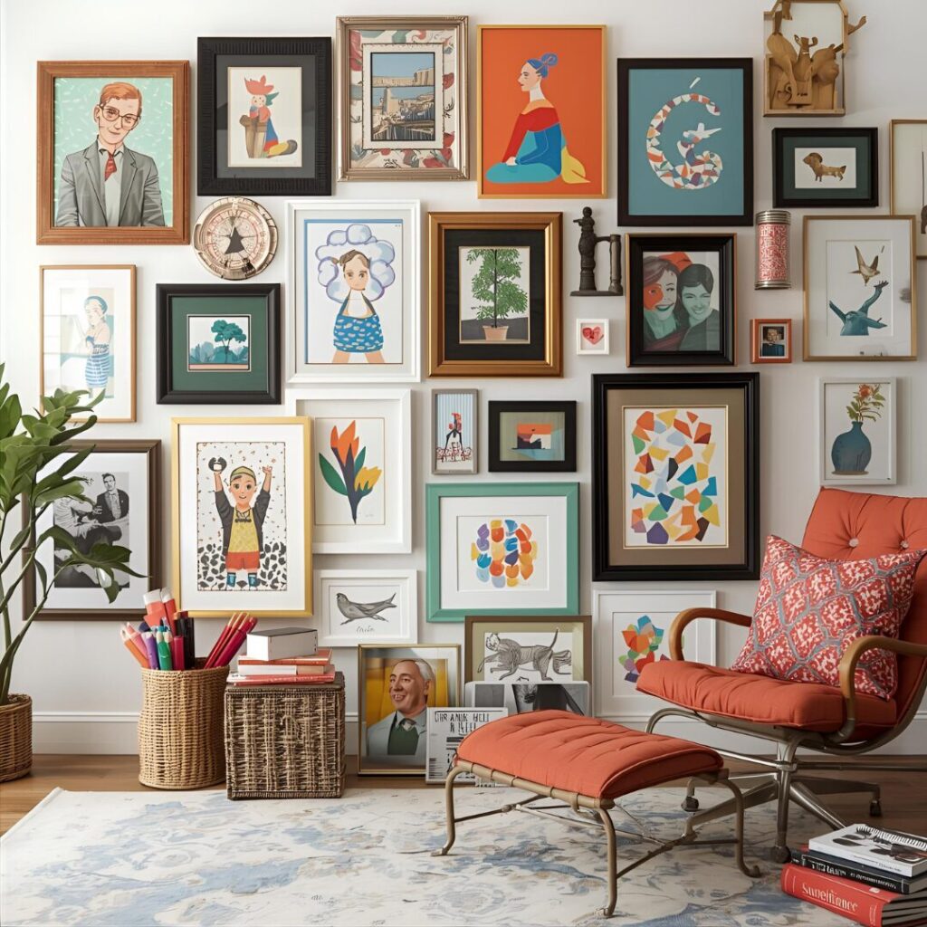 Whimsical design thrives on storytelling, and gallery walls are perfect for showcasing art, photos, and prints. Mix different frame styles, colors, and shapes to create a vibrant, collected look. The result feels curated yet playful.